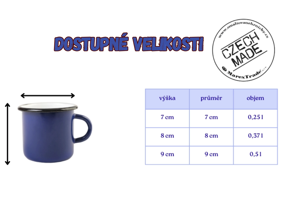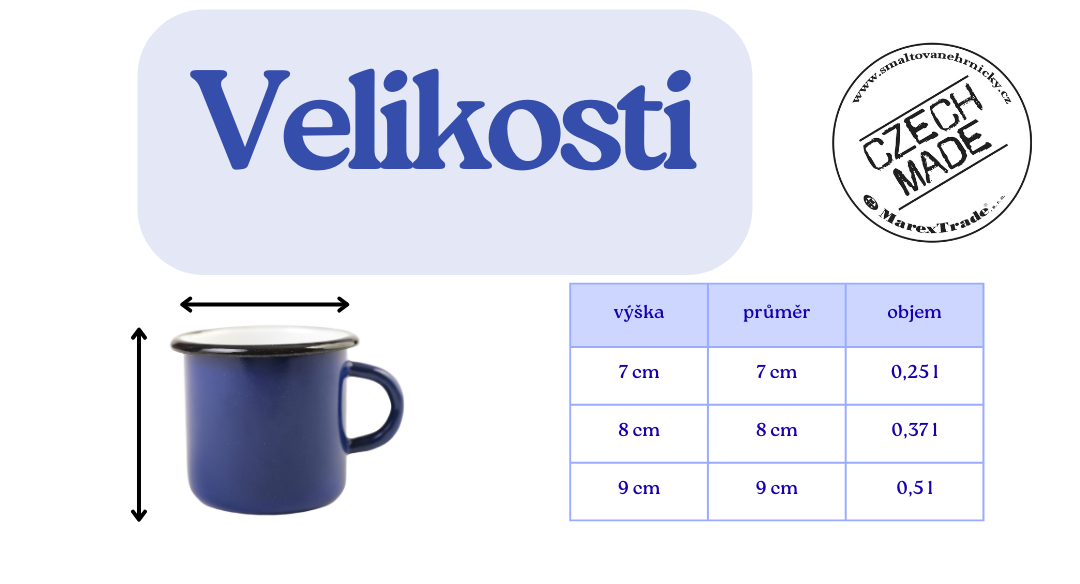 Jihočeský smalťáček můžete objednat hned v několika různých velikostech. Nabízíme průměry hrnků (objemy): 7 cm (0,25) l, 8 cm (0,37 l), 9 cm (0,5 l)